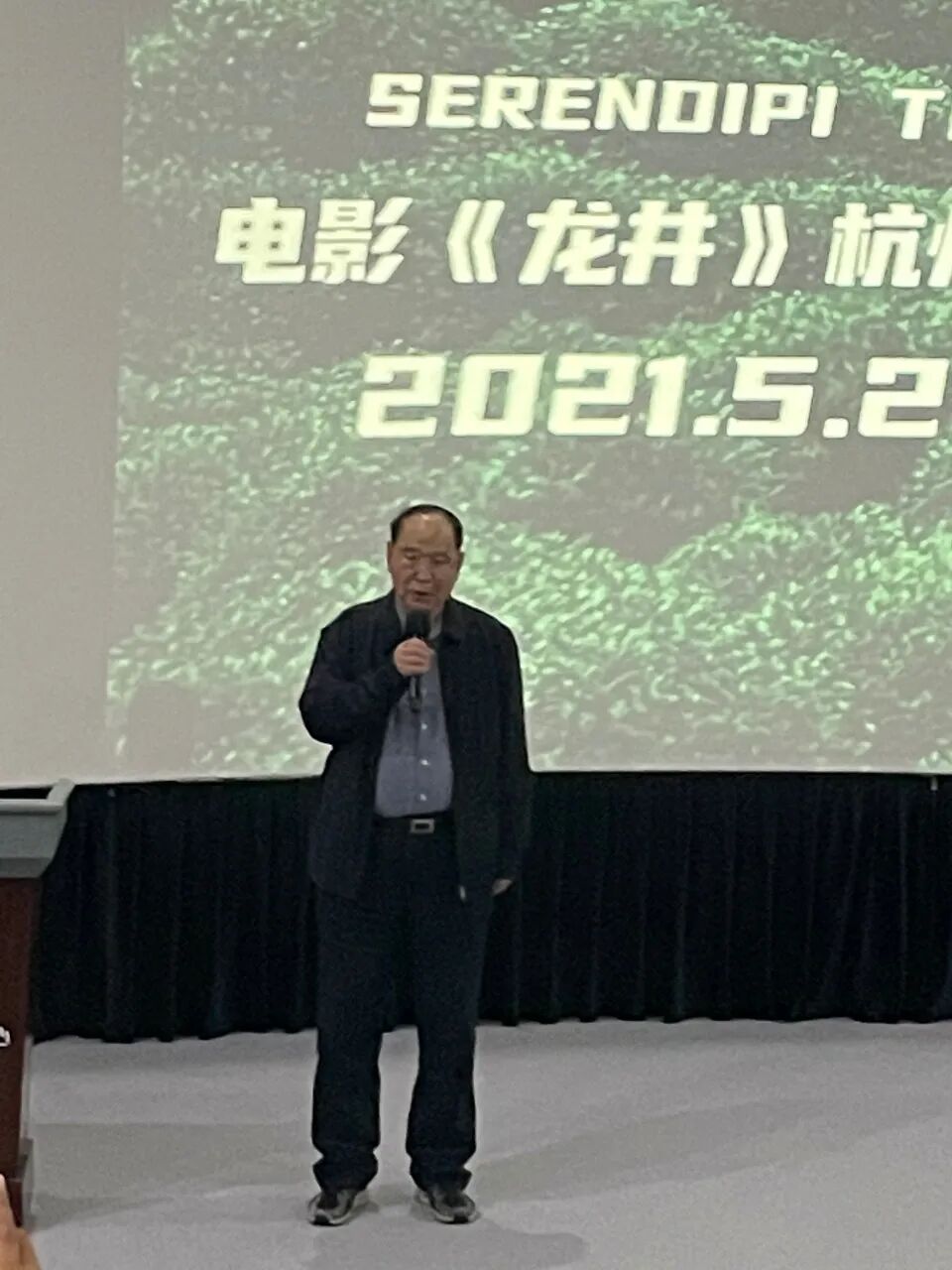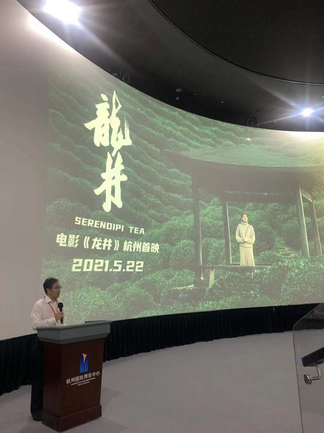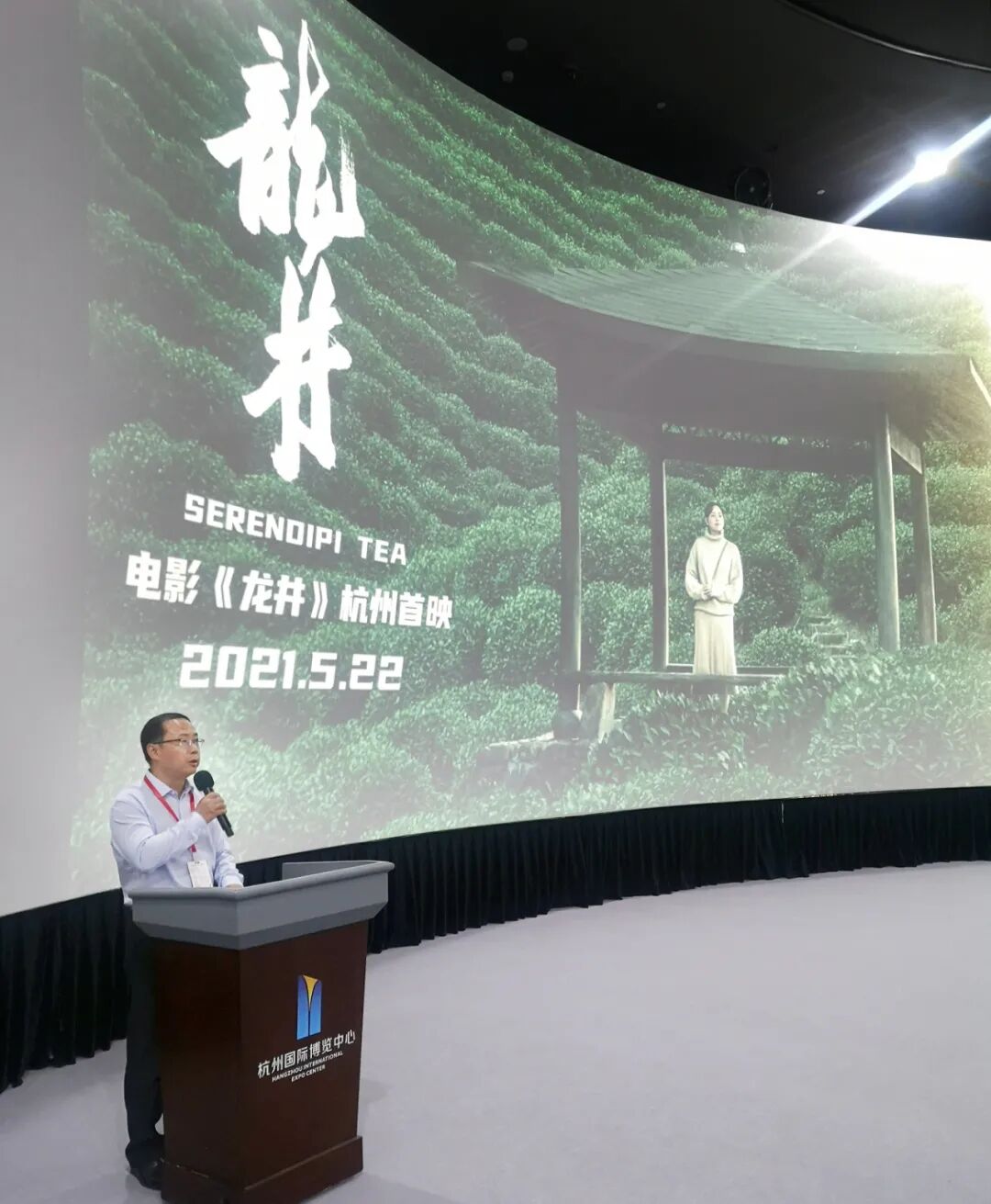 杭州市人民政府副秘书长王仁在首映式致辞中提到,茶为国饮,杭为茶都。茶叶承载着杭州数千年文化发展的辉煌的成就。今天的杭州茶机构云集,茶产业发展,茶品牌响亮,茶名人辈出,茶文化厚重,西湖龙井茶更是杭州的城市金名片,以其深厚的历史文化底蕴和“色绿、香郁、味甘、形美”的特点被誉为绿茶皇后,位列中国名茶之首。几百年,有无数关于龙井的感人故事和诸多的诗篇名句,但是以电影的形式来表现龙井的历史文化还没有出现过,在我们杭州茶人的心里,一直希望拍一部电视剧或者电影,让更多人知道龙井、了解龙井,把龙井文化传播的更广泛。在两年前的第三届中国国际茶叶博览会上,举办了电影《龙井》的新闻发布会,得到国家、省市领导关心支持,之后在杭州市茶文化研究会、西湖风景名胜区管委会、西湖区委宣传部、杭州狮峰茶叶有限公司、浙江蓝联听雨文化发展有限公司等单位和全体演职人员的共同努力下,电影龙井在杭州龙井村、梅家坞、满觉陇村、杨梅岭村、龙乌茶镇等地取景,顺利完成了拍摄任务,并于2019年10月26日杀青。两年后,我们又相聚于此,再次见证电影《龙井》与茶博会的不解之缘。这部电影展示的西湖龙井茶也是杭州历史文化的独特韵味。将更好地提升杭州城市文化内涵,更好地展示杭州茗茶之都、品质之城、人文之地的魅力,为弘扬杭州市茶文化,打响茶品牌,发展茶旅游,做强茶产业起到积极的作用。